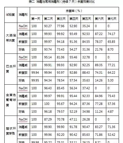 四種試驗消毒劑對大腸埃希氏菌、多殺性巴氏桿菌、金黃色葡萄球菌、蠟狀桿菌芽孢四種消毒劑指標菌的殺滅率在第一天都能達到99.9%以上,其消毒效能符合要求。2%NaOH水溶液在第二天殺菌率未達到99.9%以上;30%消毒威1:1200倍稀釋的水溶液在第四天殺菌率未達到99.9%以上;新菌敵1:500倍稀釋的水溶液在第三天殺菌率未達到99.9%以上;好典1:300倍稀釋的水溶液在第二天殺菌率未達到99.9%以上,其消毒效能不符合規(guī)定。